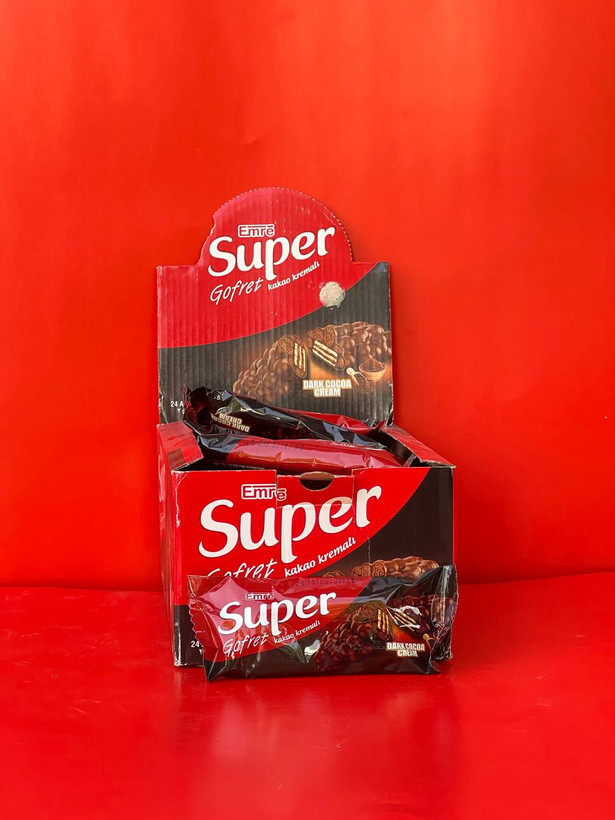 Emre Super Gofret یک نوع شکلات وافل با کرم کاکائو تلخ است که ترکیبی از بافت ترد وافل و لایه کرم کاکائویی را ارائه میدهد. این محصول دارای روکش شکلاتی به همراه تکههای شکلات است که طعم غنی و خاصی به آن میبخشد.